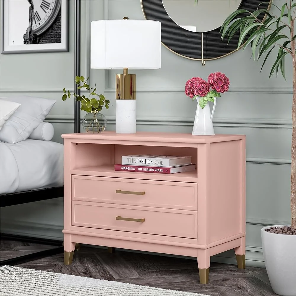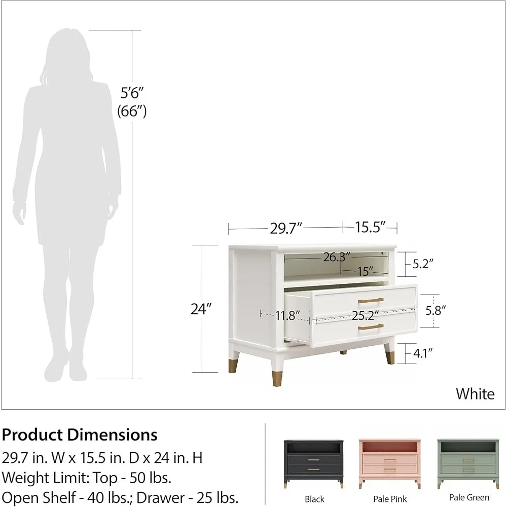 About this item UNIQUE STYLE: The Westerleigh Wide Nightstand is here, and it’s the perfect addition to your bedside FEATURES: Westerleigh features an extra wide body with a low profile for a modern and sleek look adorned with golden bronze-capped feet and hardware; The painted MDF construction is durable and easy to clean STORAGE & OPTIONS: The open shelf and spacious drawer give you plenty of storage options for all your bedside essentials; Available in multiple colors WEIGHTS & DIMENSIONS: Assembled: 29. 7″ W x 15. 5″ D x 24″ H; 58. 4 lbs. ; Open shelf: 5. 2″ H x 26. 3″ W x 15″ D; Drawer5. 8″ H x 25. 2″ W x 11. 8″ D; Max weight capacities: Top: 50 lbs. ; Shelf: 40 lbs. ; Drawer: 25 lbs.